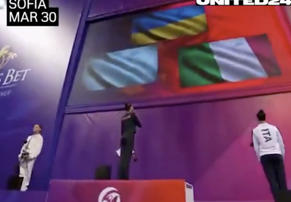 按照惯例,现场需要奏响冠军选手的国歌。乌克兰国歌响起时,现场的大屏幕上同时亮出了乌克兰及意大利的国旗,但没有显示俄罗斯的国旗。这几年,国际奥委会一直要求俄罗斯和白俄罗斯运动员只能以中立个人运动员的身份参加国际赛事。